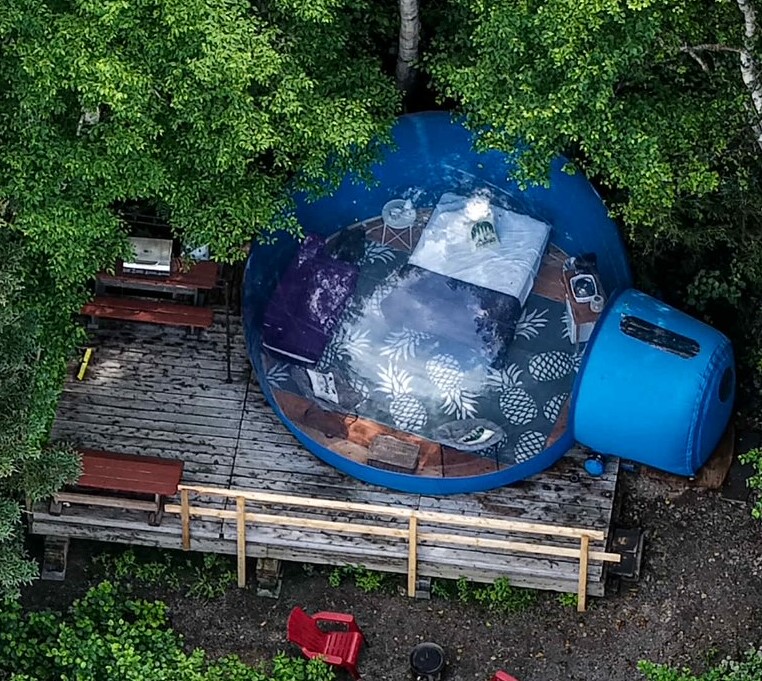 Sphère de 4 mètres, plancher de bois, lit double, fauteuil, cafetière Keurig, frigo, prise électrique, chaufferette, BBQ, foyer extérieur au propane, chaises